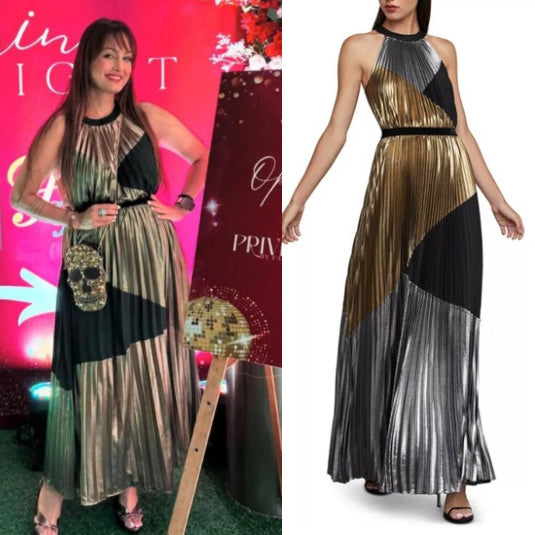 Nisha Rawal stuns in a chic metallic halter neck dress, exuding elegance and modern glamour. The shimmering fabric perfectly complements her confident and radiant style. Get the look and make a statement with our exclusive collection!