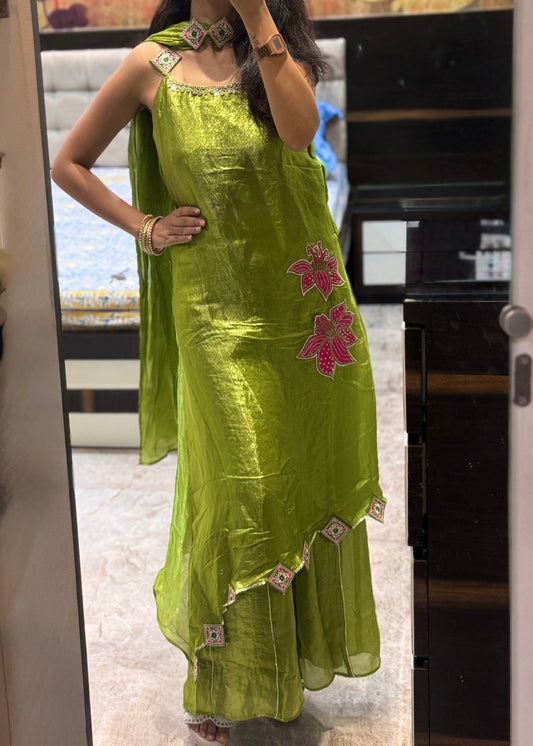 3 Pc Set - Embroidered Kurta, Flare Pants and Choker Dupatta